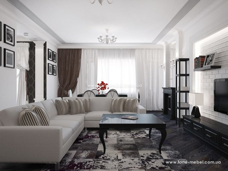 Стоит  подумать о функциональном разделении интерьера на зону отдыха с большим диваном и телевизором, рабочую зону с письменным столом и полками,  а также зону развлечений, для детей. Семейное пространство должно учитывать потребности всех членов семьи. В гостиной также есть место для столовой, где семья сможет вместе поесть.