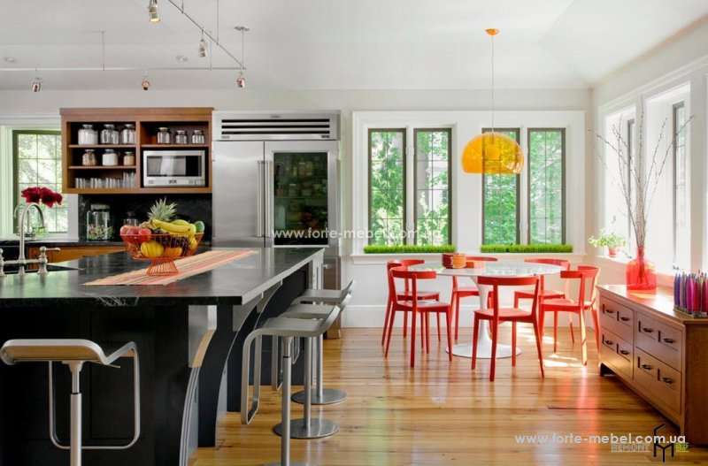 Независимо от того, будет ли столовая  отдельным помещением или находится в  кухне, как правило, стол должен вместить больше людей. Очень популярны столы деревянные раскладные, но какие стулья к ним подобрать? Конечно, они должны гармонировать с характером всего помещения. Для классических интерьеров идеально подойдут стулья с обивкой из ткани или кожи. В более современных интерьерах хорошо будут выглядеть цветные деревянные стулья или пластиковые. Комплект может дополнять, кроме того, несколько складных стульев, которые пригодятся, когда мы принимаем гостей.
