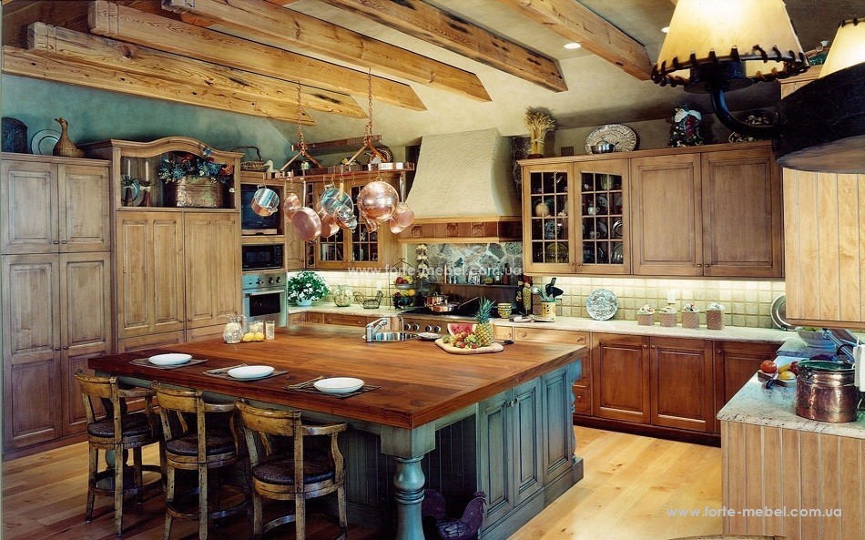 В кухне, оформленной в  деревенском стиле, все вещи, которые нужны нам во время приготовления пищи, у нас на расстоянии вытянутой руки.  Кастрюли, сковородки, разделочные доски или ножи, не нужно прятать глубоко в шкафах. Разнообразные контейнеры со специями, сушеные фрукты или цветы, мы можем держать на высоте: на  открытых полках, на подоконнике или столе.  С такой мебелью идеально сочетаются также аксессуары из кованого железа: массивные и заметные петли шкафов, ручки для мебели, рейлинги.