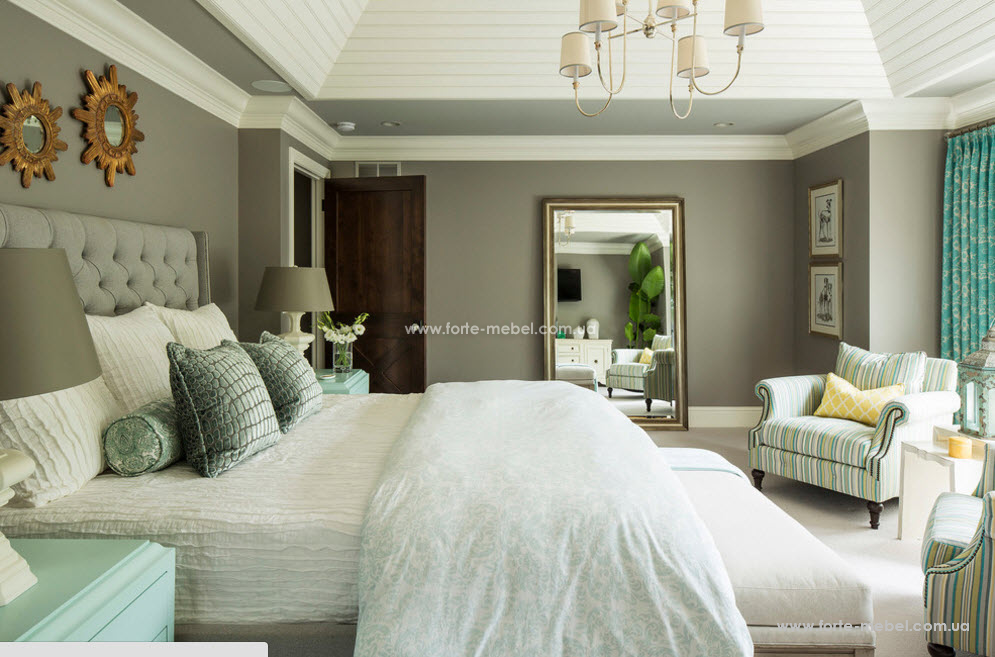 В дизайне интерьера, используют такие цвета, как голубой, оттенки серого, слоновая кость, гранат и красный. Однако, выбирая цвет краски, нужно помнить о том, что яркие цвета стен обеспечивают ощущение простора, а темные и интенсивные цвета стен уменьшают зрительно интерьер, поэтому хорошо смотрятся в больших и хорошо освещенных помещениях. Хорошо зарекомендовали себя также контрастные сочетания мебели и стен, то есть, например, темно-коричневая мебель на фоне кремовых стен.