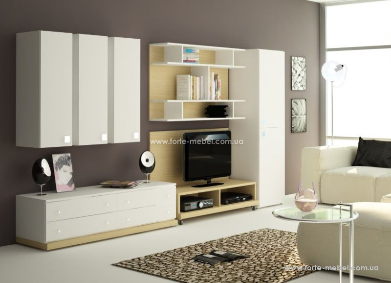 Если вы поклонник современного стиля и минимализма, несомненно, заинтересуют вас более необычные, геометрические фигуры. Мебель для гостиной в современном стиле имеет простую форму и гладкие фасады, часто без ручек. Является отличным решением для небольшого метража, так как зрительно увеличивает интерьер.