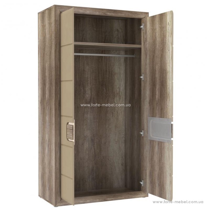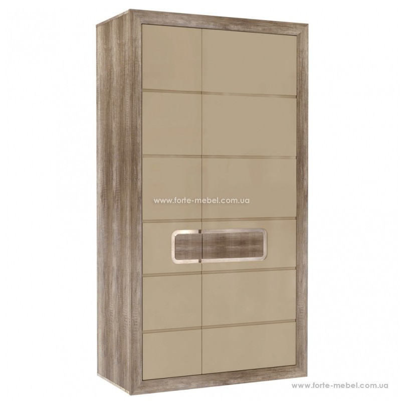 Дводверна шафа, виконана в стилі античного дуба зі структурою, що імітує деревне зерно. Блискучі фасади були вбудовані в широкі бічні смуги корпусу.