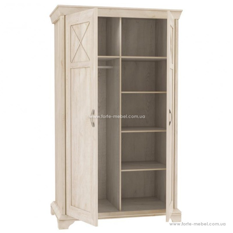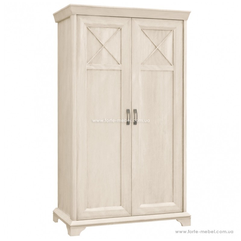 Дводверна шафа, виготовлена в декорі Пінія Біла. Характер меблів підкреслюється масивними плінтусами та верхнім ободом. Вся стилістика доповнюється ручками у кольорі, що імітує старе срібло. Інтер'єр гардеробу обладнаний шістьма місткими полицями та вішалкою для одягу. Гардероб із колекції меблів KASHMIR.