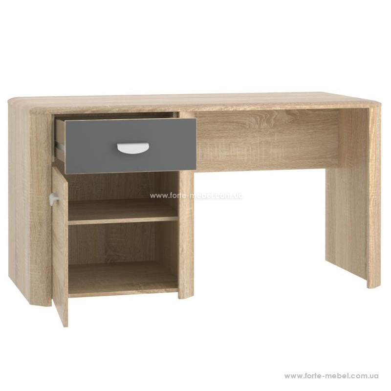 Стіл у сучасному кольорі Дуб Сонома з сірою матовою вставкою та характерними бічними «порізами» корпусу - це оригінальні меблі, створені відповідно до сучасних тенденцій, які, безумовно, сподобаються вимогливій молоді. Стіл оснащений висувною скринькою та двома великими полицями, прихованими за передньою панеллю шафи, що значно полегшує підтримання порядку.