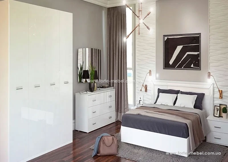 Меблі для спальні світлих відтінків користуються великою популярністю серед покупців. Вони ідеально підходять практично до будь-якого типу оформлення. З одного боку, білі меблі для спальні надзвичайно практичні, а з іншого, додають інтер'єру затишку. Вони  ідеально підходять для невеликих приміщень, поєднуються з аксесуарами будь-якого кольору, оптично збільшують та освітлюють навіть найтіснішу кімнату.